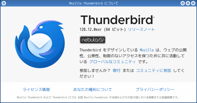 初回起動時は「アカウント設定」からはじまります。 起動直後の状態です。 2025年7月24日の時点で、下記のバージョンでした。 「アカウント設定」他、操作方法の詳細は「メールクライアント - Thunderbird」でどうぞ。 |