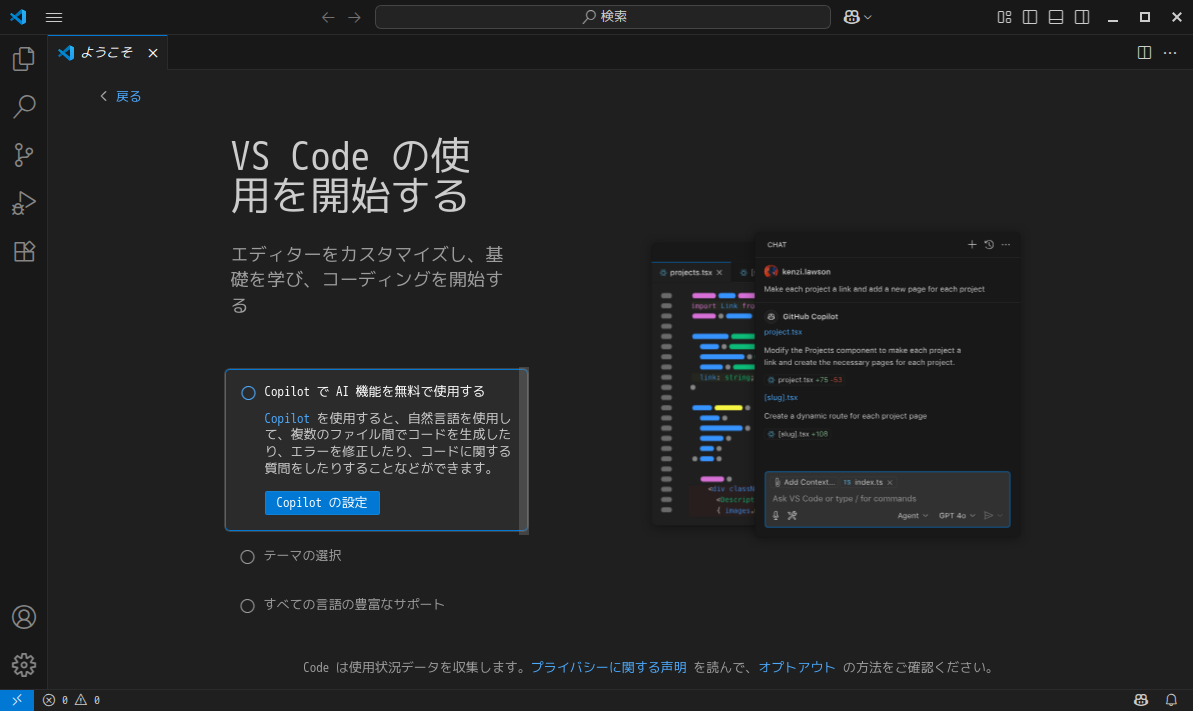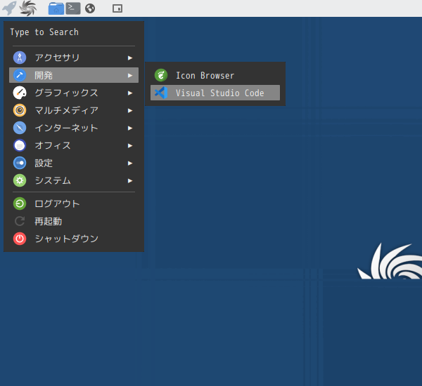 1. 概要 開発環境として、「Visual Studio Code」を使用します。 2. インストール 「APTus AppCenter」でインストールします。 インストールの手順については、「Visual Studio Code - インストール・更新」をご参照ください。 3. 起動 「スタート」→「開発」→「Visual Studio Code」→「Visual Studio Code」