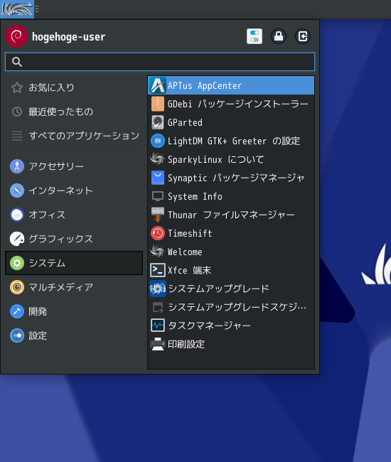 以下、「XFCE」を例題としています。  「スタート」→「システム」→「APTus AppCenter」