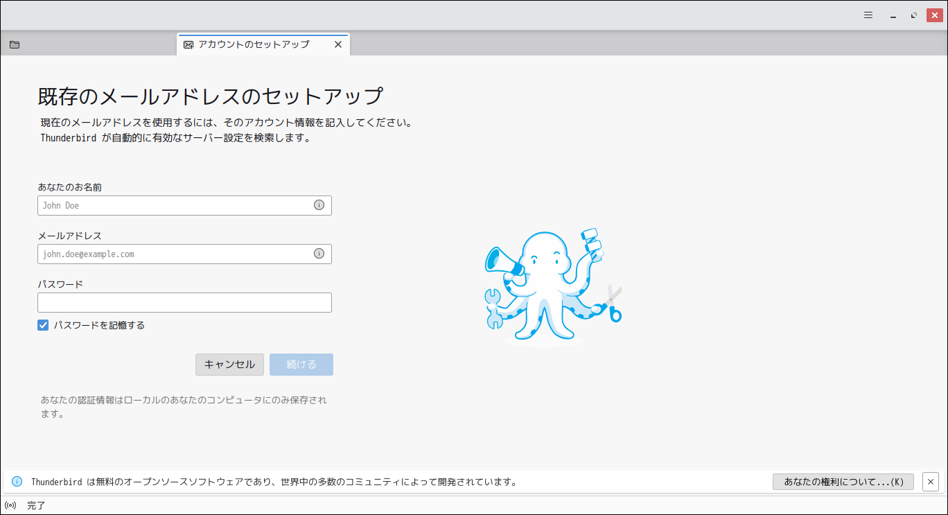 初回起動時は「メールアカウント セットアップ」からはじまります。