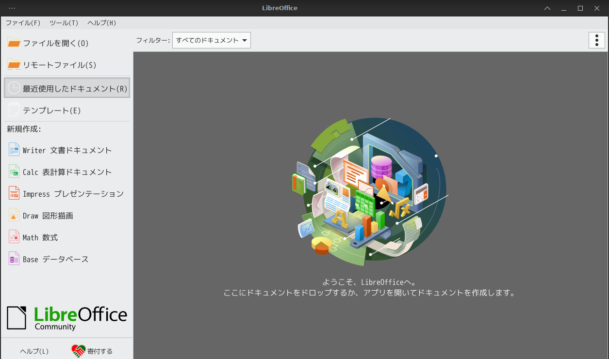 1. 概要 オフィススイートとして「LibreOffice」を使用します。 今回は、言語パッケージのインストールにより、この時点で、日本語化されています。 2. 起動 「スタート」→「オフィス」→「LibreOffice Start Center」