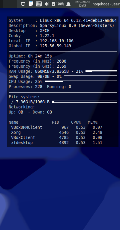 再ログイン後、デスクトップ右に、「Conky」の表示が現れます。