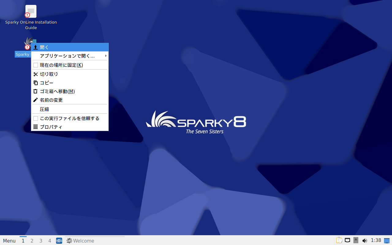 1. 概要 インストールについては、「SparkyLinux - 8.0 - 共通事項」をご参照ください。 2. インストール インストール時のデスクトップで、インストーラを右クリックして。 「開く」でインストールを開始します。