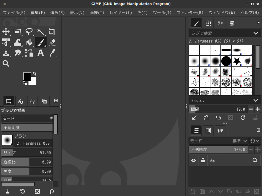 「閉じる」 起動直後の状態です。 2025年8月18日の時点で、下記のバージョンでした。 操作については、「画像編集ソフト GIMP2」に掲載しています。 上記は簡単なものですので、詳細なものがほしい方は、各所に初歩の手引きから応用編までありますので、そちらを参考にしてください。 |