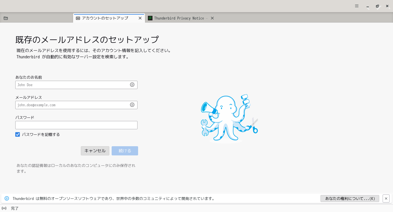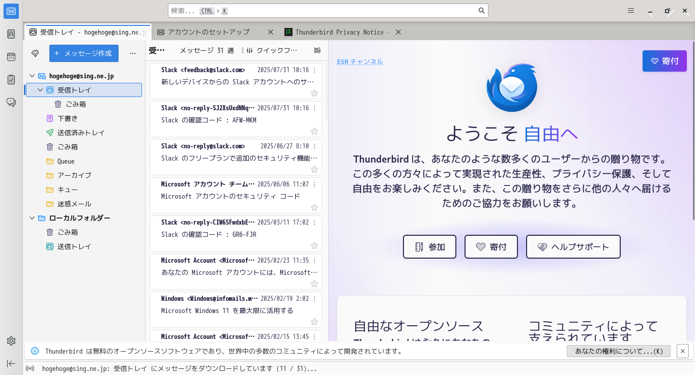 初回起動時は「メールアカウント セットアップ」からはじまります。 起動後に受信トレイを開いた状態です。 2025年8月18日の時点で、下記のバージョンでした。 「メールアカウン セットアップ」他、操作方法の詳細は「メールクライアント - Thunderbird」でどうぞ。 |