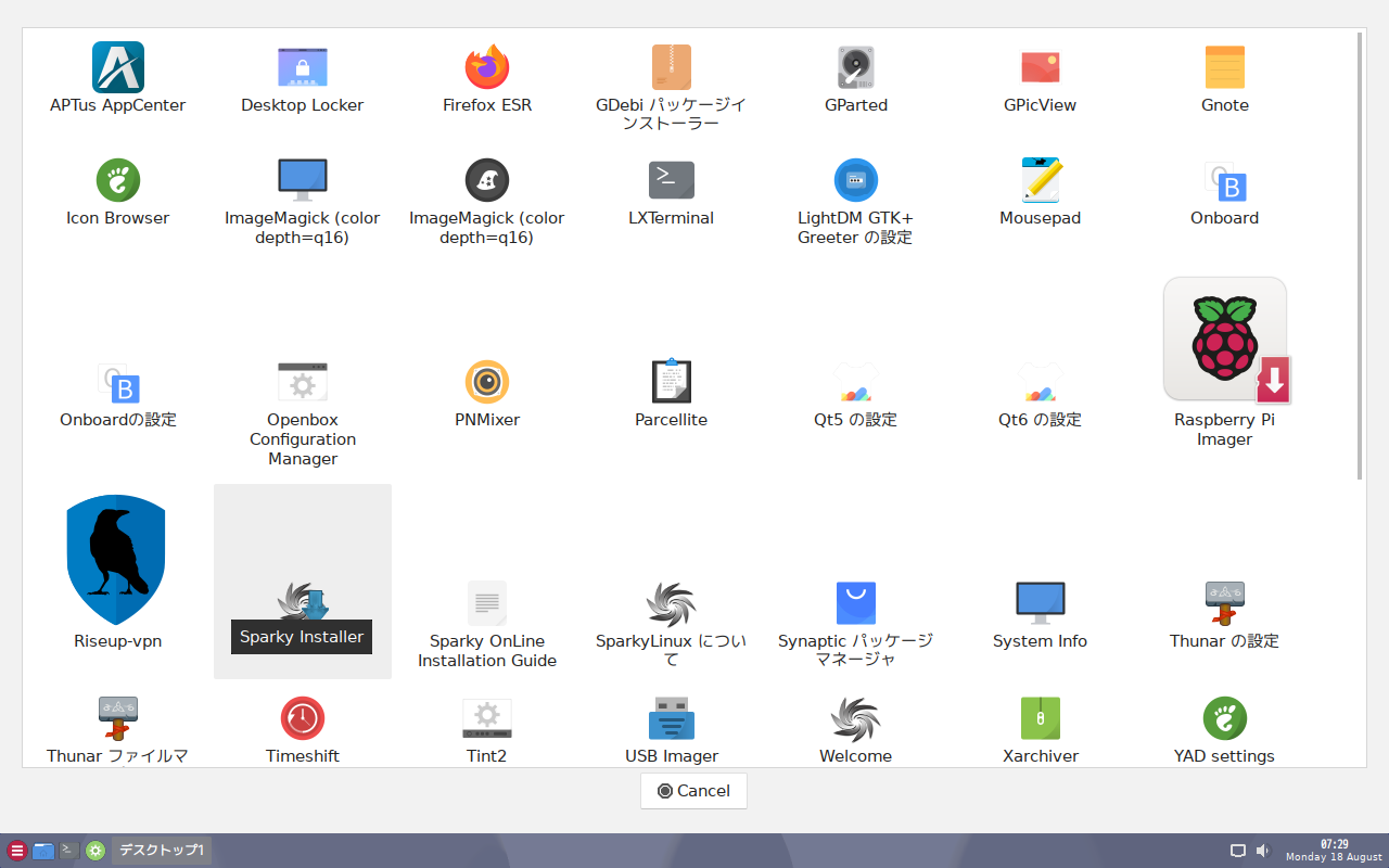 以降は、「SparkyLinux - 8.0 - 共通事項 - インストール」をご参照ください。