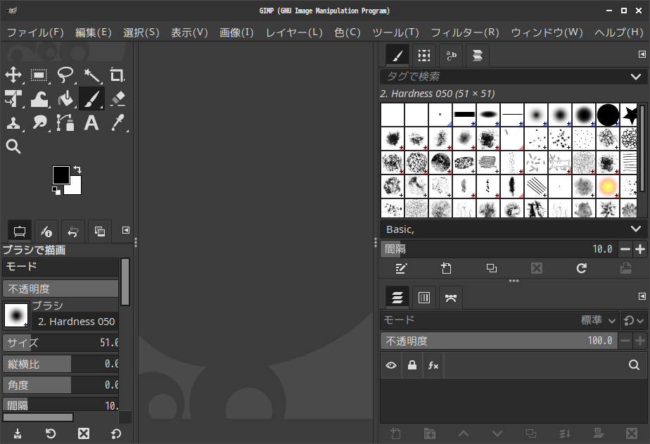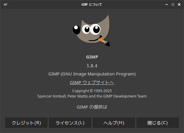 「閉じる」 起動直後の状態です。 2025年8月19日の時点で、下記のバージョンでした。 操作については、「画像編集ソフト GIMP」に掲載しています。 上記は簡単なものですので、詳細なものがほしい方は、各所に初歩の手引きから応用編までありますので、そちらを参考にしてください。 |