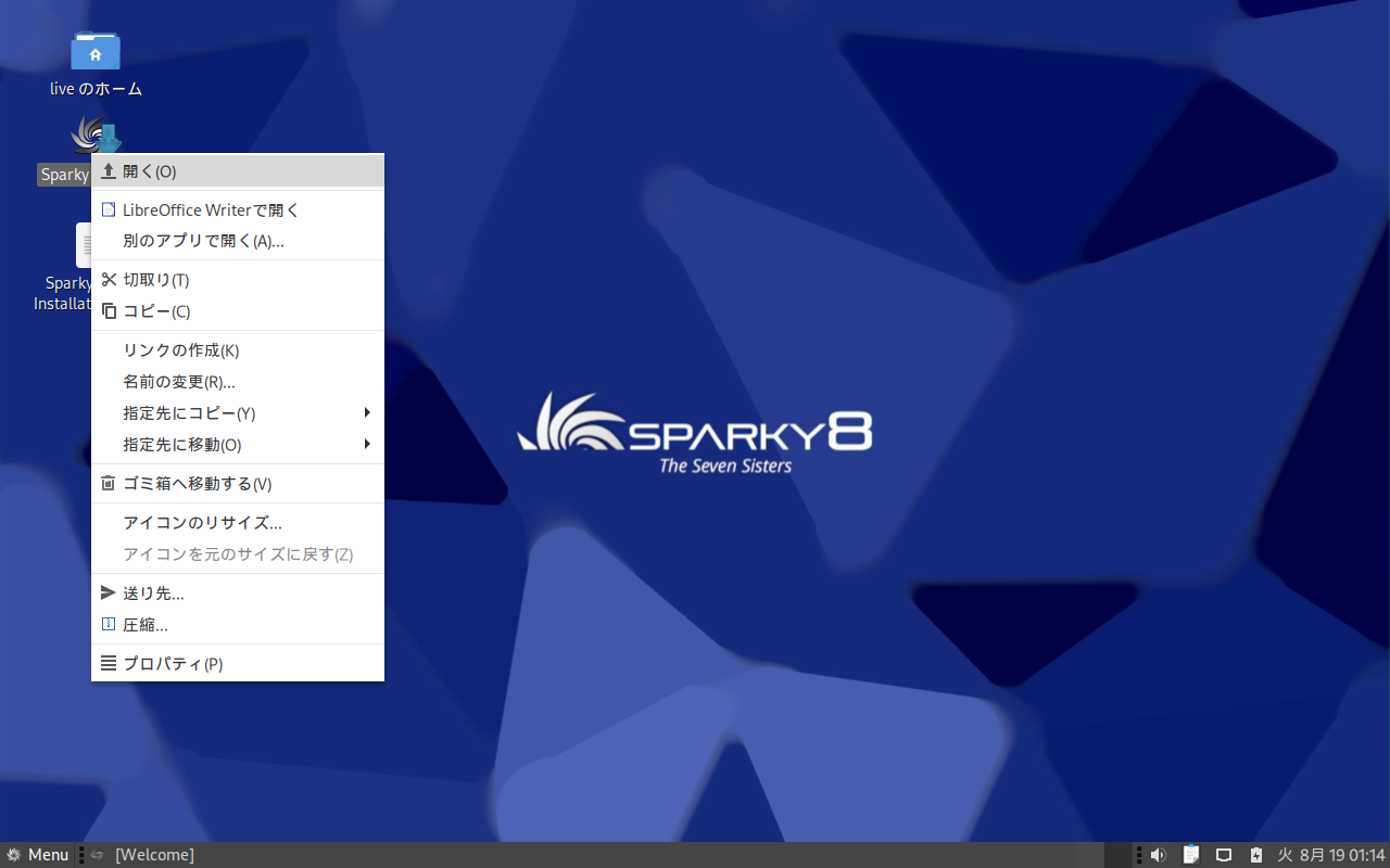 1. 概要 おそらく、「8.0」から。 「MATE」のインストールメディアが用意されました。 2. インストール インストールについては、「SparkyLinux - 8.0 - 共通事項 - インストール」をご参照ください。 インストール時のデスクトップで、「Welcome」を閉じ、インストーラを右クリックして、「開く」