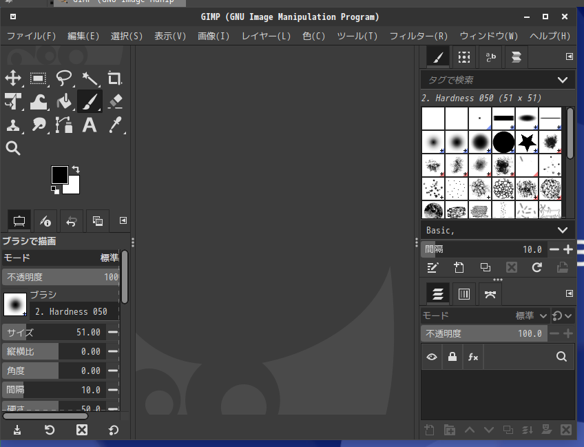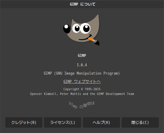 「閉じる」 起動直後の状態です。 2025年8月19日の時点で、下記のバージョンでした。 操作については、「画像編集ソフト GIMP」に掲載しています。 上記は簡単なものですので、詳細なものがほしい方は、各所に初歩の手引きから応用編までありますので、そちらを参考にしてください。 |