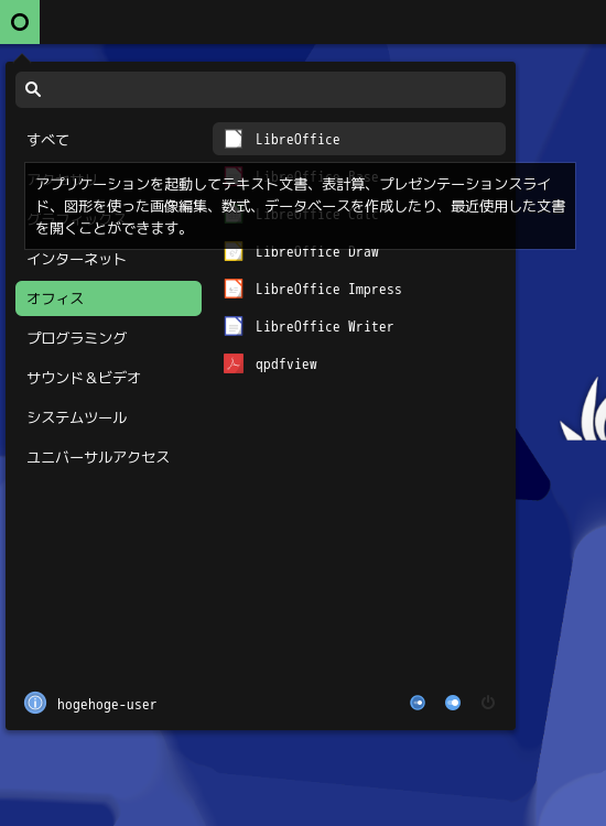 1. 概要 オフィススイートとして「LibreOffice」を使用します。 「BUDGIE」を「Openbox」上にインストールしていますが、「Openbox」には、「LibreOffice」は、デフォルトでは、インストールされていません。 2. インストール 「Synaptic」で、「libreoffice-l10n-ja」「libreoffice」を検索して、それぞれインストールします。 本体と言語パッケージと両方インストールしなければ、なりません。 3. 起動 「スタート」→「オフィス」→「LibreOffice Start Center」→「LibreOffice Start Center」