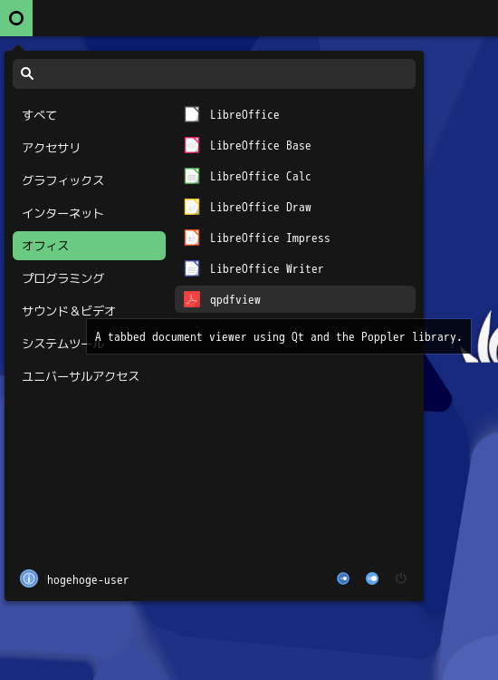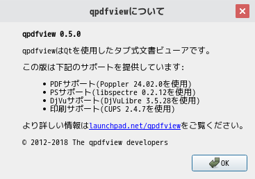 1. 概要 ドキュメントビューアとして、「qpdfview」を使用します。 「BUDGIE」を「Openbox」上にインストールしていますが、「qpdfview」は、「Openbox」にデフォルトでインストールされています。 言語パッケージをインストールした時点で、日本語化されます。 言語パッケージのインストールに関しては、「Linux - SparkyLinux - 8.0 - 共通事項」をご参照ください。 「.pdf」以外のファイルが見られるかは、存じません。 2. 起動 「スタート」→「オフィス」→「qpdfview」