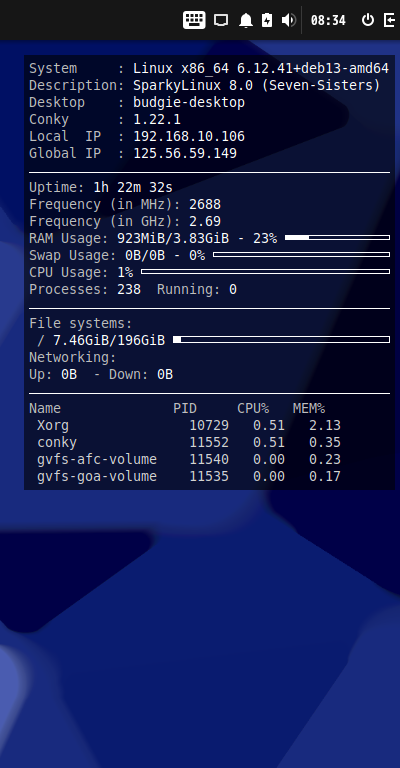再ログイン後、デスクトップ右に、「Conky」の表示が現れます。