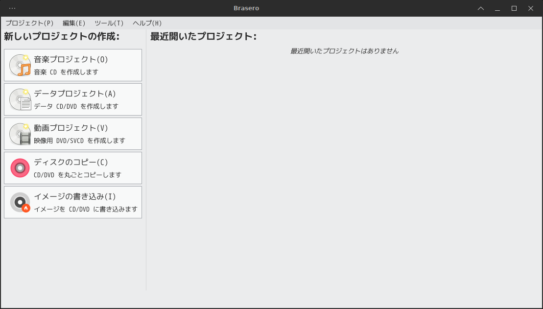 1. 概要 光ディスク(CD・DVD)ライティングソフトとして、「Brasero」を使用します。 2. インストール 「Synaptic」で、「brasero」を検索して、インストールします。 3. 起動 「スタート」→「マルチメディア」→「Brasero」