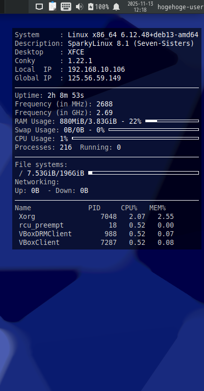 再ログイン後、デスクトップ右に、「Conky」の表示が現れます。