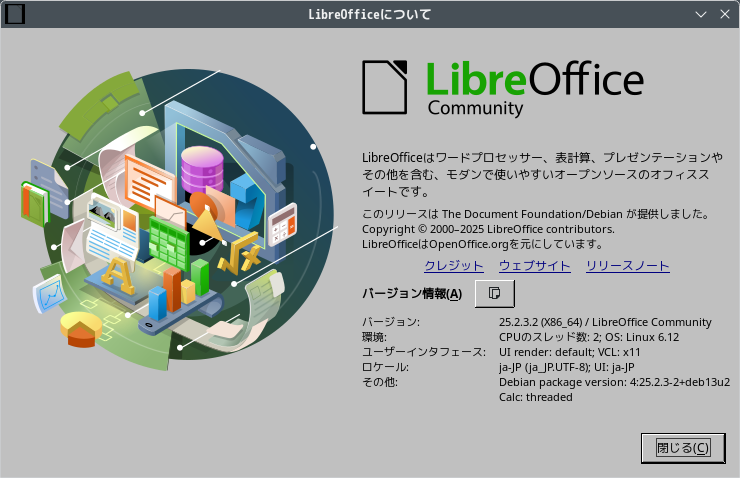 オフィススイートとして「LibreOffice」を使用します。  「LibreOffice」はデフォルトでインストールされています。  言語パッケージをインストールした時点で、日本語化されます。  言語パッケージのインストールに関しては、「Linux - SparkyLinux - 8.1 - 共通事項」をご参照ください。