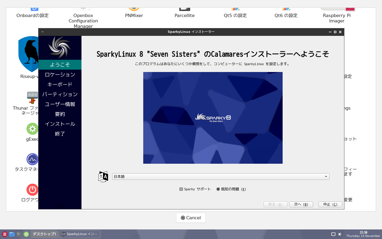 「Sparky Installer」をダブルクリック。 以降は、「Linux - SparkyLinux - 8.1 - 共通事項」をご参照ください。 ログイン画面が表示されれば、インストールは完了です。 |