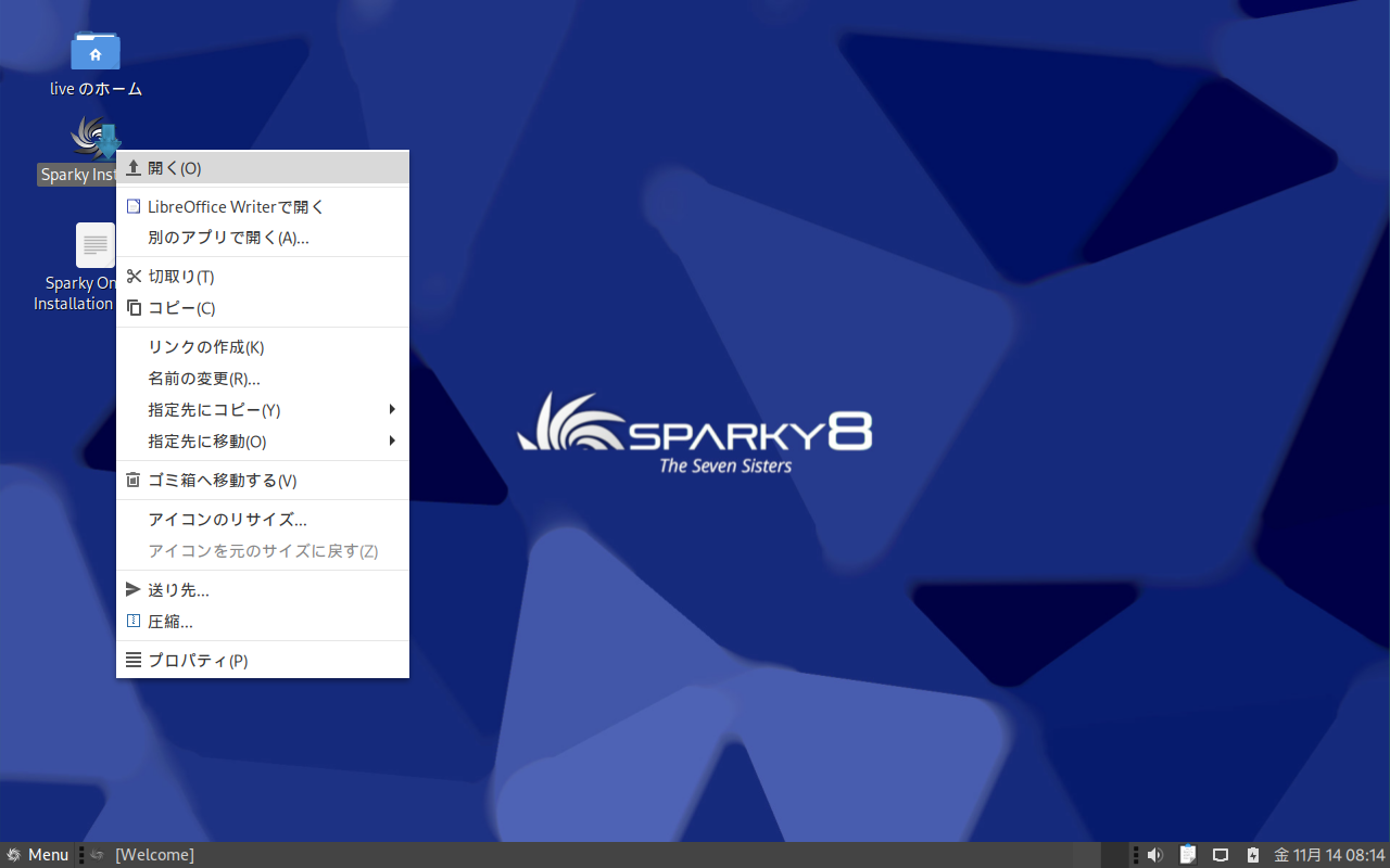 1. 概要 「MATE」のデスクトップ環境をインストールします。 2. インストール インストールについては、「SparkyLinux - 8.1 - 共通事項」をご参照ください。 インストール時のデスクトップで、「Welcome」を閉じ、インストーラを右クリックして、「開く」