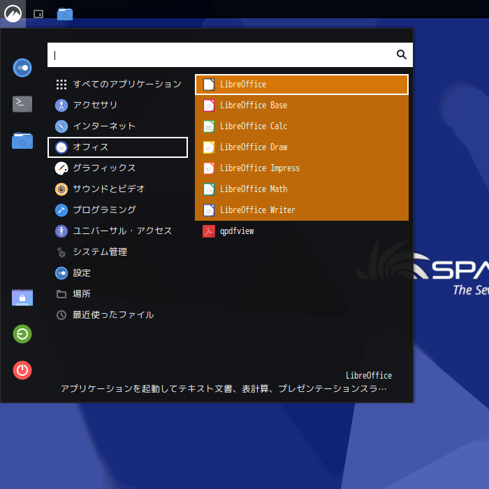 1. 概要 オフィススイートとして「LibreOffice」を使用します。 「Cinnamon」を「Openbox」上にインストールしていますが、「Openbox」には、「LibreOffice」は、デフォルトでは、インストールされていません。 2. インストール 「Synaptic」で、「libreoffice-l10n-ja」「libreoffice」を検索して、それぞれインストールします。 本体と言語パッケージと両方インストールしなければ、なりません。 3. 起動 「スタート」→「オフィス」→「LibreOffice Start Center」→「LibreOffice Start Center」