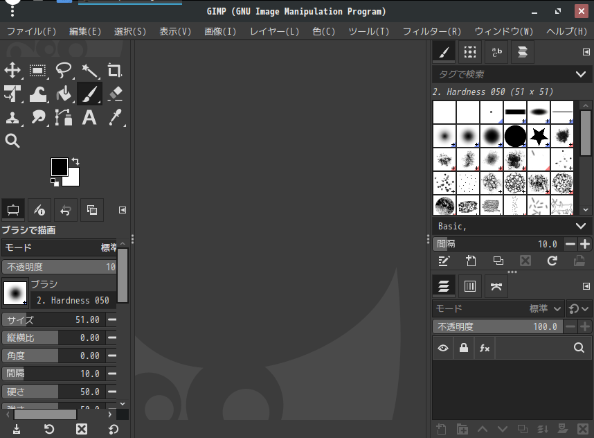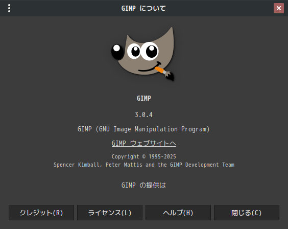 「閉じる」 起動直後の状態です。 2025年11月17日の時点で、下記のバージョンでした。 操作については、「画像編集ソフト - GIMP」に掲載しています。 上記は簡単なものですので、詳細なものがほしい方は、各所に初歩の手引きから応用編までありますので、そちらを参考にしてください。 |