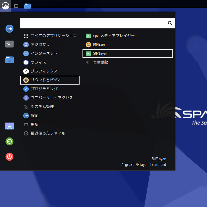 1. 概要 マルチメディアプレイヤーとして、「SMPlayer」をインストールして使用します。 2. インストール 「Synaptic」で、「smplayer」を検索して、インストールします。 3. 起動 「スタート」→「サウンドとビデオ」→「SMPlayer」