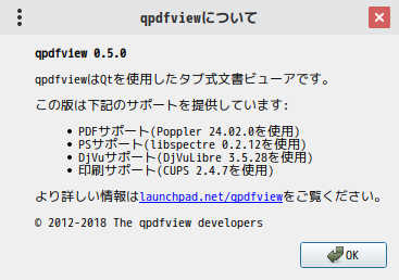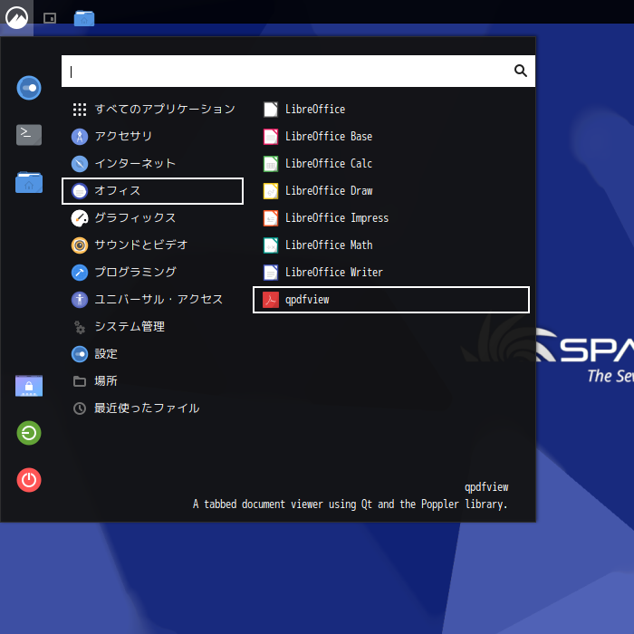 1. 概要 ドキュメントビューアとして、「qpdfview」を使用します。 「Cinnamon」を「Openbox」上にインストールしていますが、「qpdfview」は、「Openbox」にデフォルトでインストールされています。 言語パッケージをインストールした時点で、日本語化されます。 言語パッケージのインストールに関しては、「Linux - SparkyLinux - 8.1 - 共通事項」をご参照ください。 「.pdf」以外のファイルが見られるかは、存じません。 2. 起動 「スタート」→「オフィス」→「qpdfview」