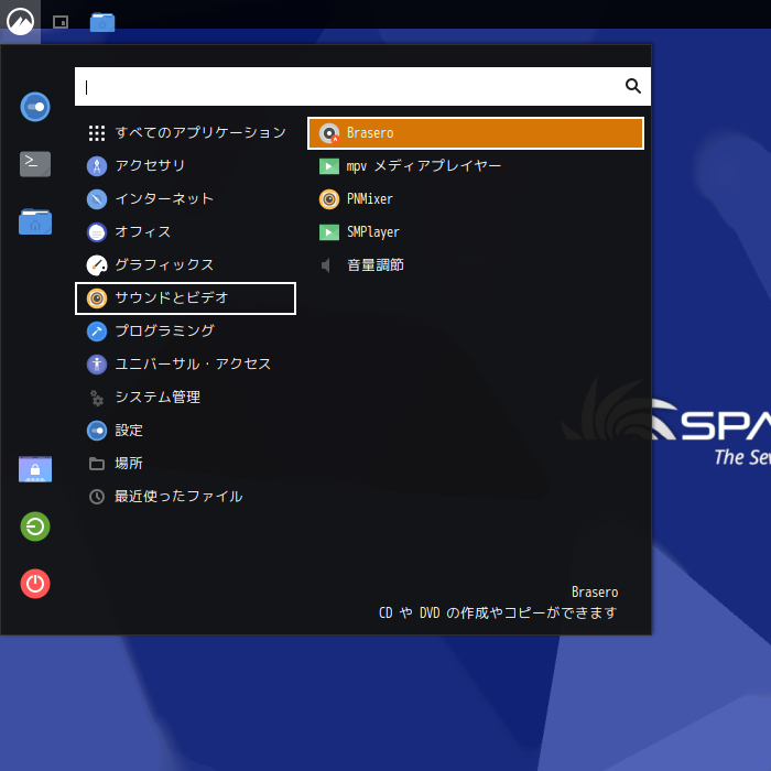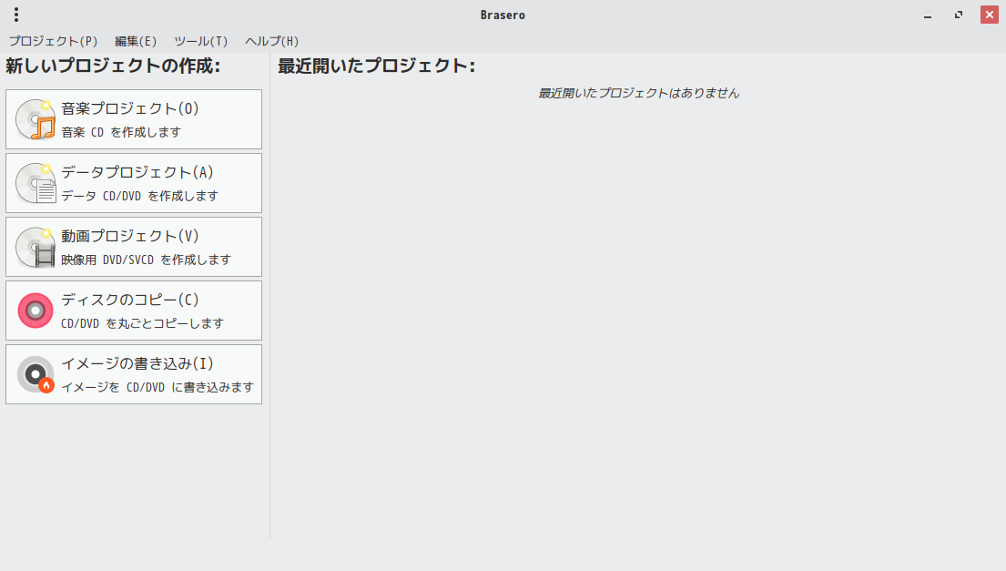 1. 概要 光ディスク(CD・DVD)ライティングソフトとして、「Brasero」を使用します。 2. インストール 「Synaptic」で、「brasero」を検索して、インストールします。 3. 起動 「スタート」→「サウンドとビデオ」→「Brasero」