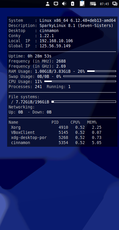 再ログイン後、デスクトップ右に、「Conky」の表示が現れます。
