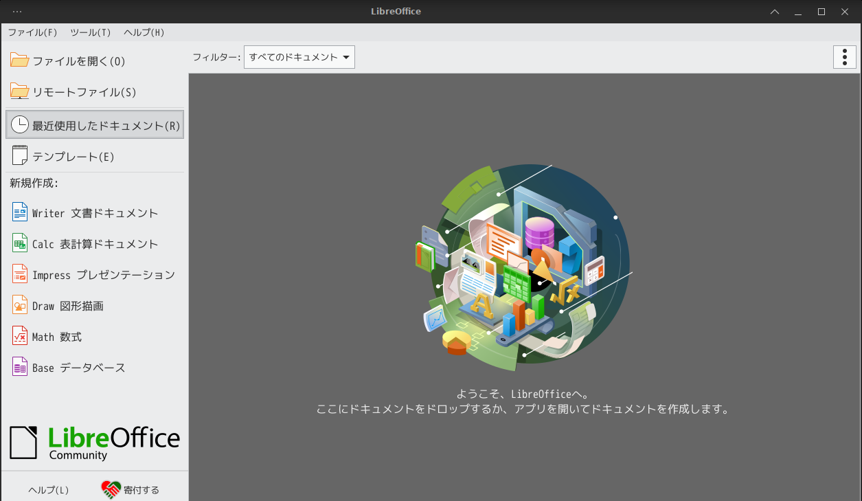 1. 概要 オフィススイートとして「LibreOffice」を使用します。 日本語言語パッケージをインストールした時点で、日本語化されています。 2. 起動 「スタート」→「オフィス」→「LibreOffice」