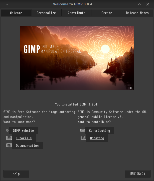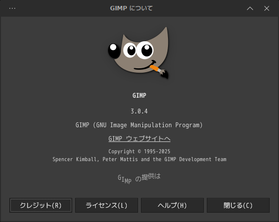 「閉じる」 起動直後の状態です。 2026年2月17日の時点で、下記のバージョンでした。 操作については、「画像編集ソフト - GIMP」に掲載しています。 上記は簡単なものですので、詳細なものがほしい方は、各所に初歩の手引きから応用編までありますので、そちらを参考にしてください。 |