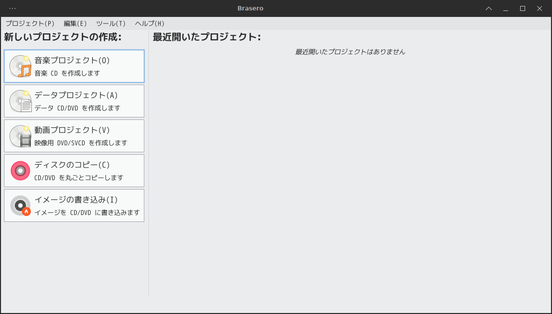 1. 概要 光ディスク(CD・DVD)ライティングソフトとして、「Brasero」を使用します。 2. インストール 「Synaptic」で、「brasero」を検索して、インストールします。 3. 起動 「スタート」→「マルチメディア」→「Brasero」