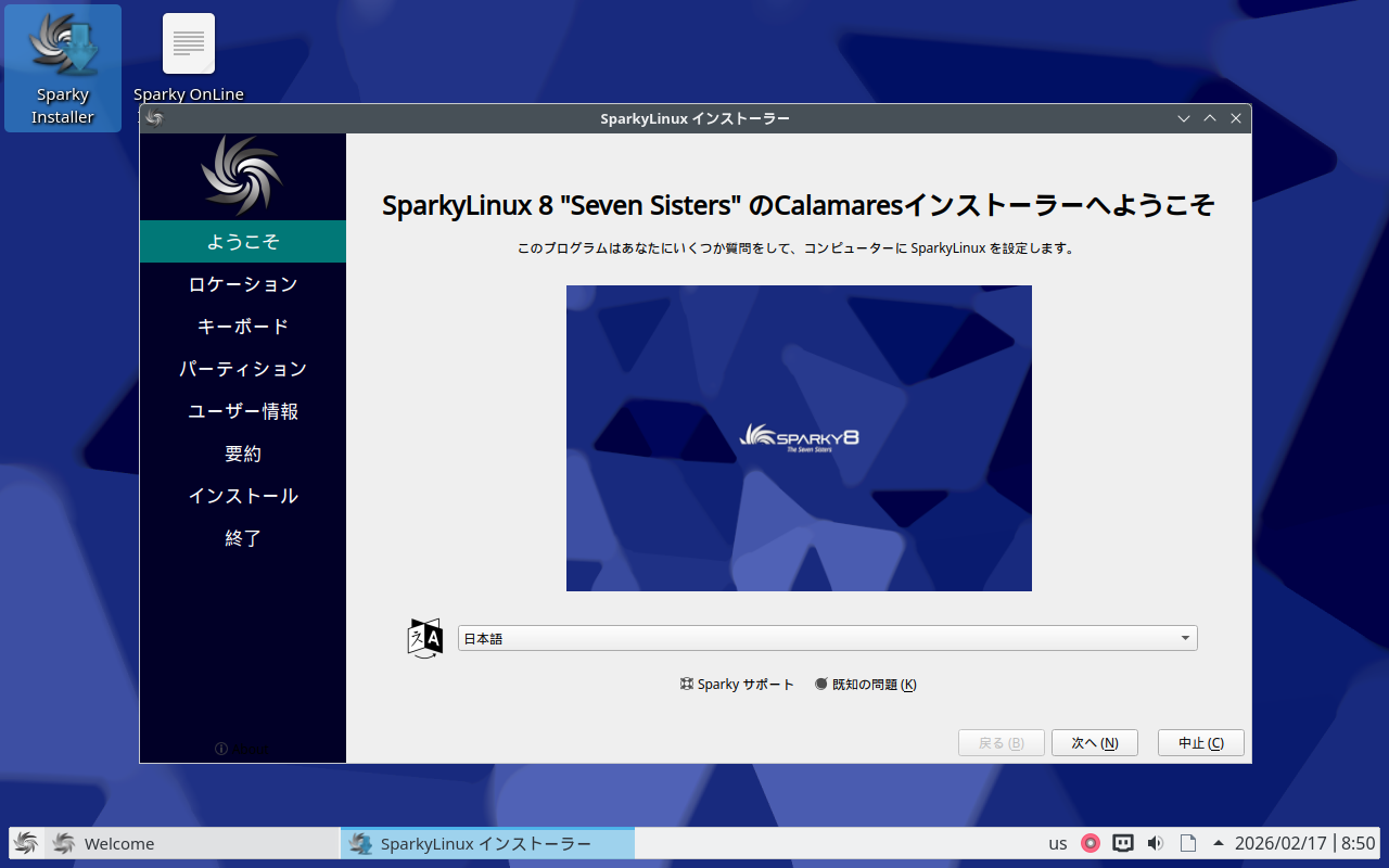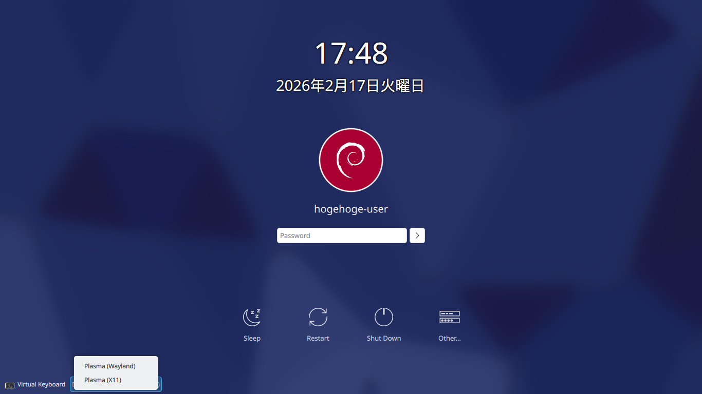 以降は、「Linux - SparkyLinux - 8.2 - 共通事項」をご参照ください。 ログイン画面が表示されれば、インストールは完了です。 「Wayland」「X11」の選択肢がありますが、「VirtualBox」上で動作させる場合は、「X11」でログインするのが無難です。 |