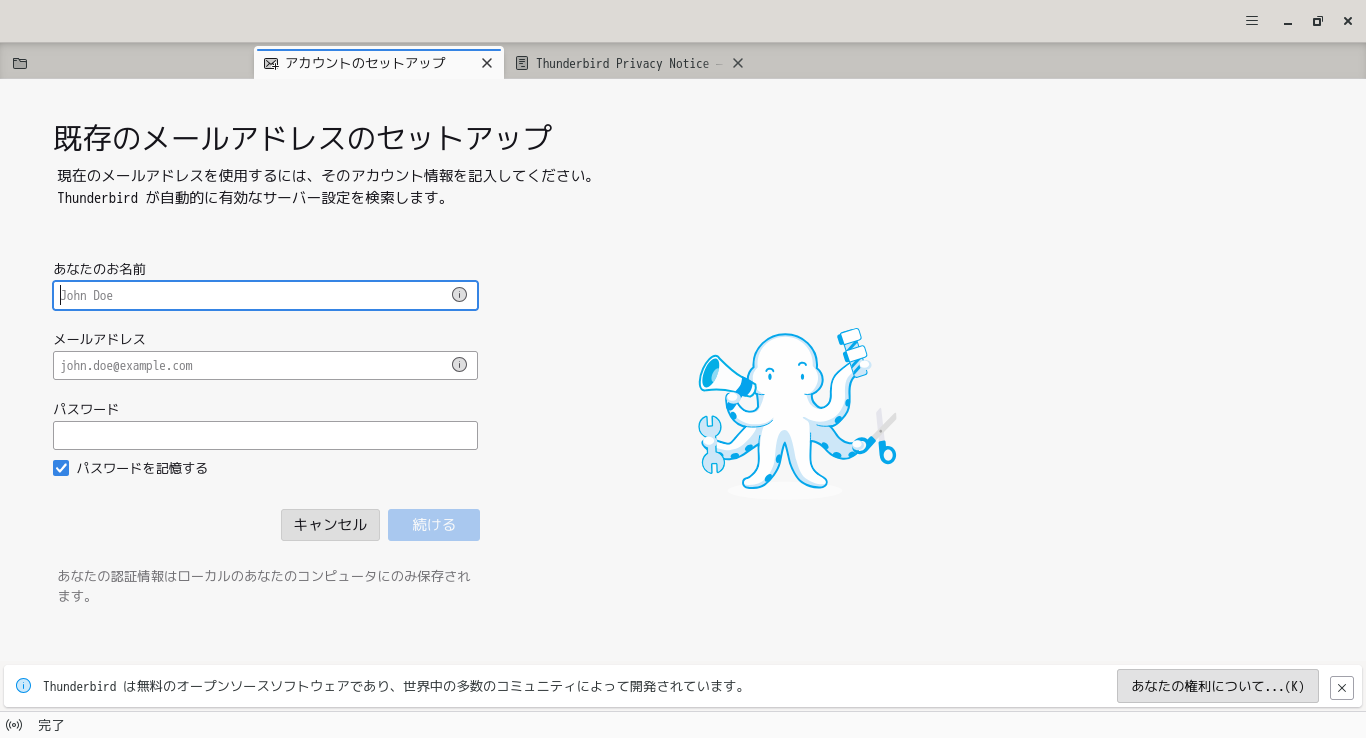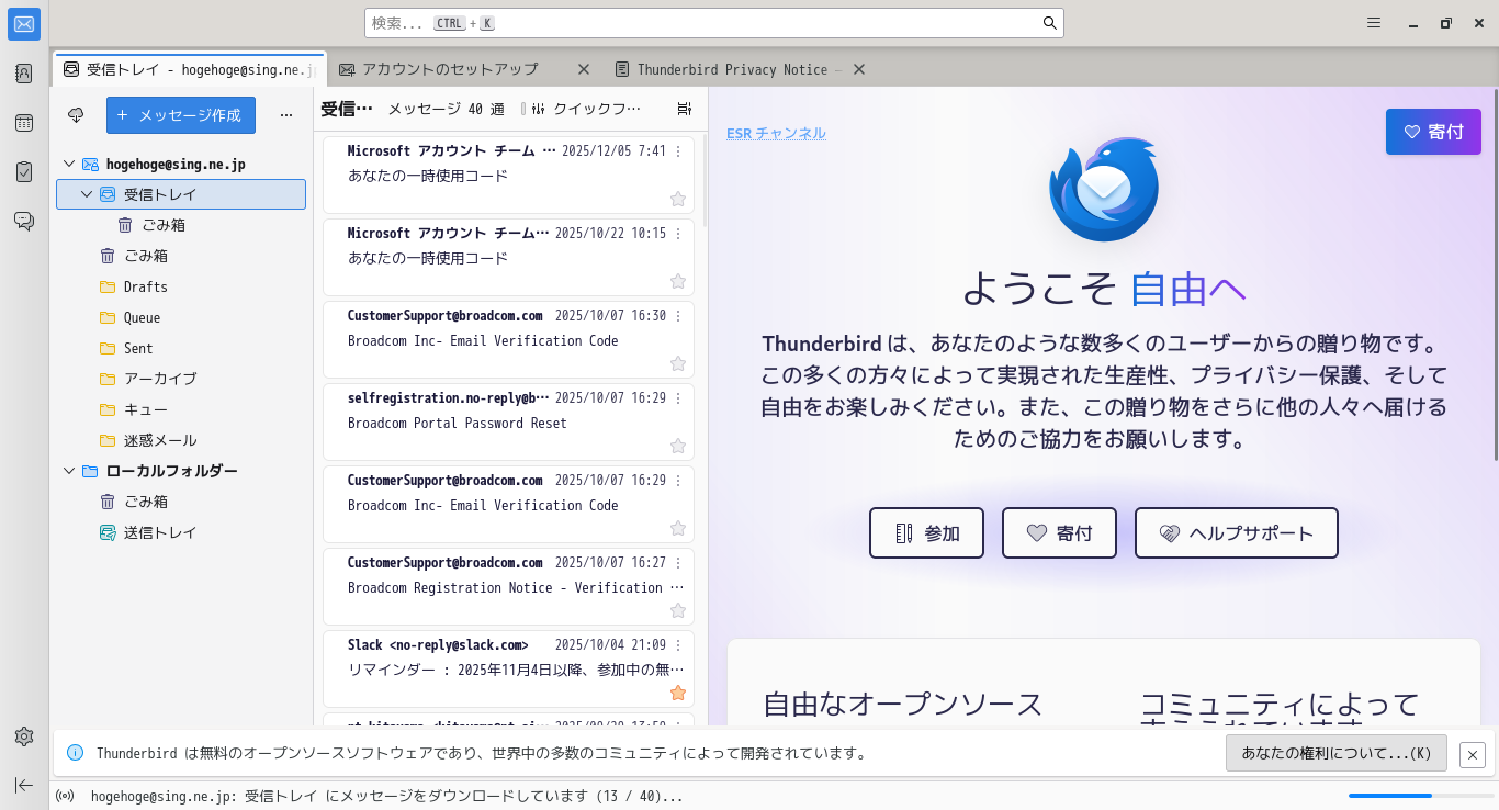 初回起動時は「メールアカウント セットアップ」からはじまります。 起動後に受信トレイを開いた状態です。 2026年2月18日の時点で、下記のバージョンでした。 「メールアカウン セットアップ」他、操作方法の詳細は「メールクライアント - Thunderbird」でどうぞ。 |