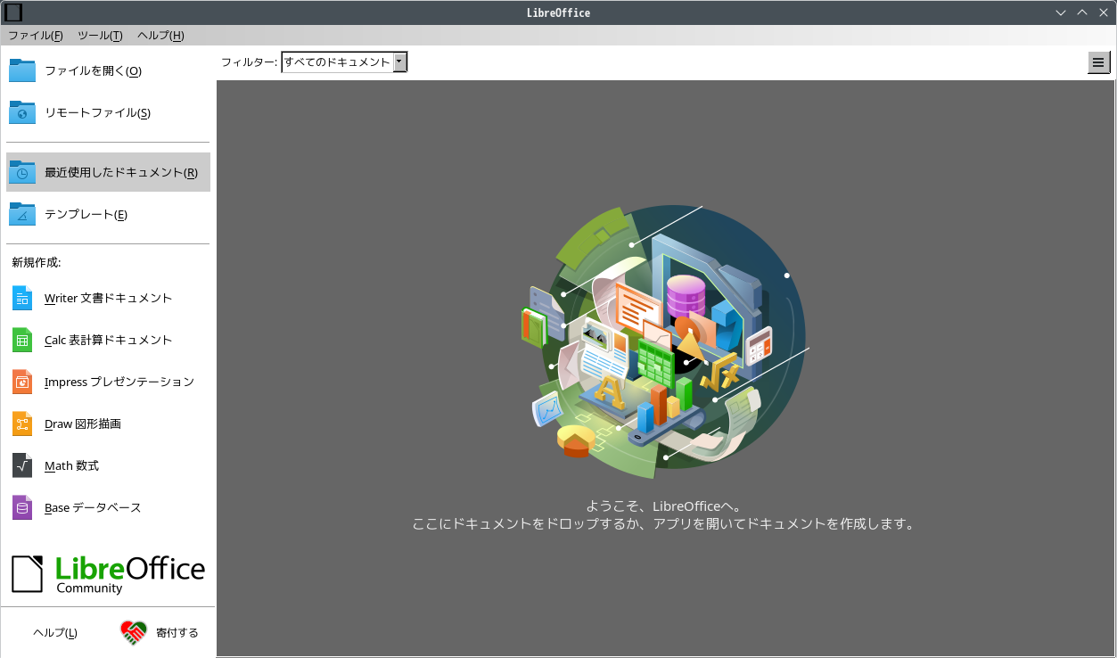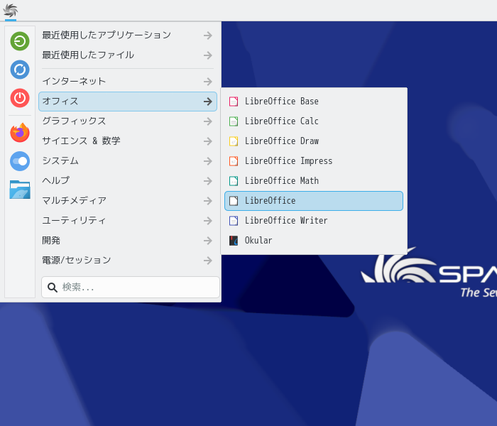 1. 概要 オフィススイートとして「LibreOffice」を使用します。 「LibreOffice」はデフォルトでインストールされています。 言語パッケージをインストールした時点で、日本語化されます。 言語パッケージのインストールに関しては、「Linux - SparkyLinux - 8.2 - 共通事項」をご参照ください。 2. 起動 「スタート」→「オフィス」→「LibreOffice」