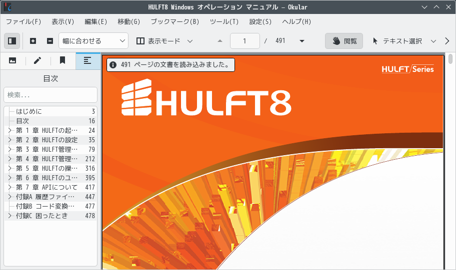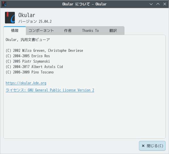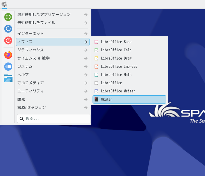 1. 概要 ドキュメントビューアとして、「Okular」を使用します。 「Okular」は、デフォルトでインストールされています。 言語パッケージをインストールした時点で、日本語化されます。 言語パッケージのインストールに関しては、「Linux - SparkyLinux - 8.2 - 共通事項」をご参照ください。 2. 起動 「スタート」→「オフィス」→「Okular」
