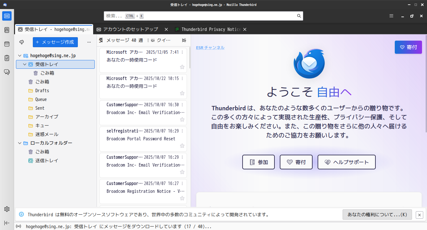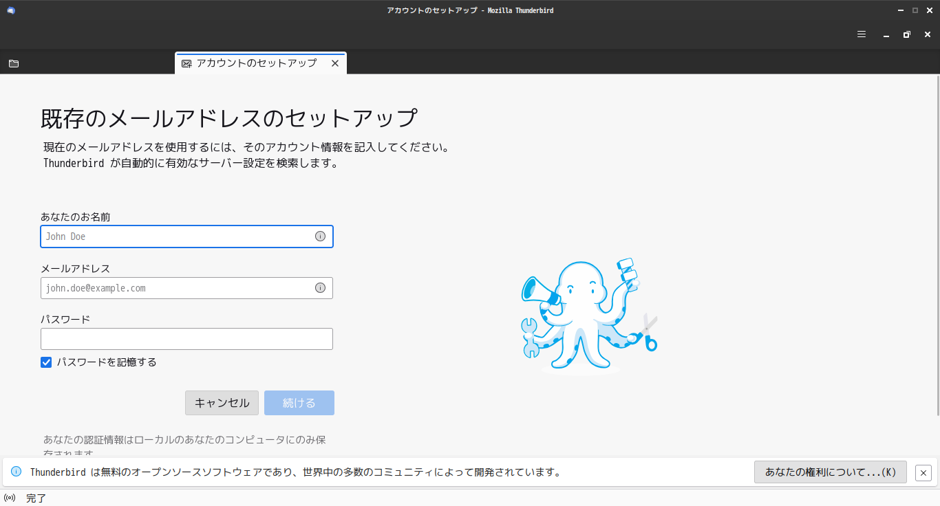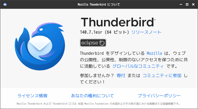 初回起動時は「アカウント設定」からはじまります。 起動直後の状態です。 2025年8月18日の時点で、下記のバージョンでした。 「設定ウィザード」他、操作方法の詳細は「メールクライアント - Thunderbird」でどうぞ。 |