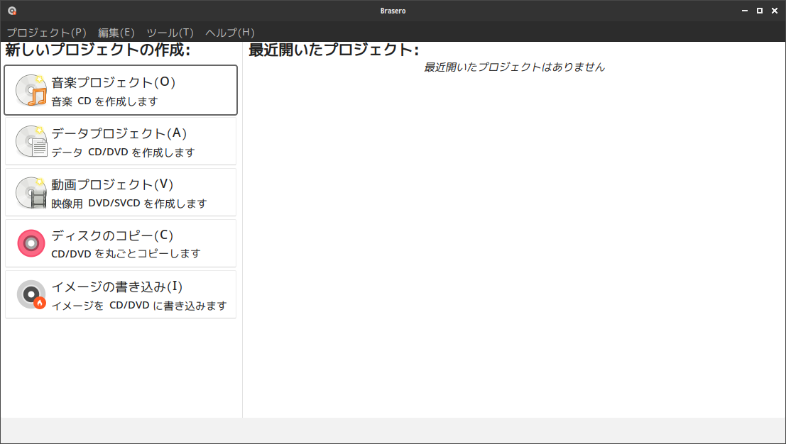 1. 概要 光ディスク(CD・DVD)ライティングソフトとして、「Brasero」を使用します。 2. インストール 「Synaptic」で、「brasero」を検索して、インストールします。 3. 起動 「スタート」→「マルチメディア」→「Brasero」