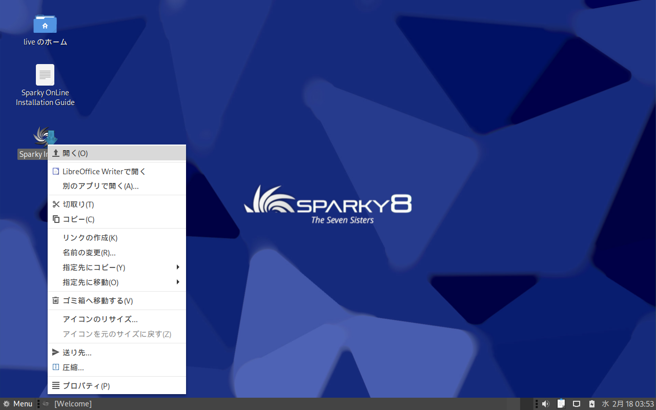 1. 概要 「MATE」のデスクトップ環境をインストールします。 2. インストール インストールについては、「SparkyLinux - 8.2 - 共通事項」をご参照ください。 インストール時のデスクトップで、「Welcome」を閉じ、インストーラを右クリックして、「開く」