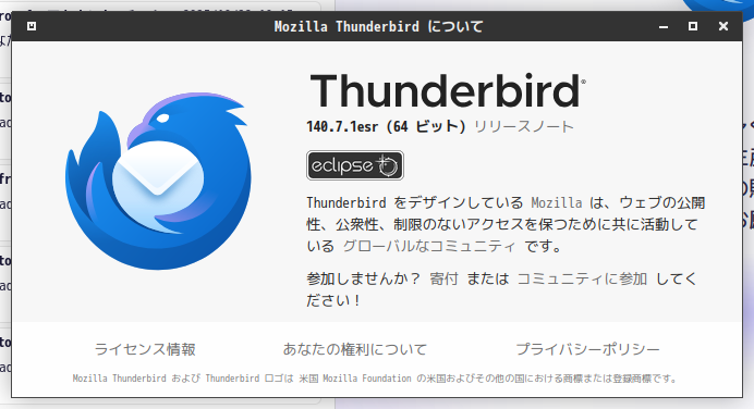 初回起動時は「アカウント設定」からはじまります。 起動後に受信トレイを開いた状態です。 2026年2月19日の時点で、下記のバージョンでした。 「アカウント設定」他、操作方法の詳細は「メールクライアント - Thunderbird」でどうぞ。 |