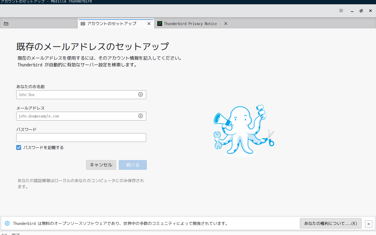 初回起動時は「アカウント設定」からはじまります。 起動直後の状態です。 2026年2月19日の時点で、下記のバージョンでした。 「アカウント設定」他、操作方法の詳細は「メールクライアント - Thunderbird」でどうぞ。 |
