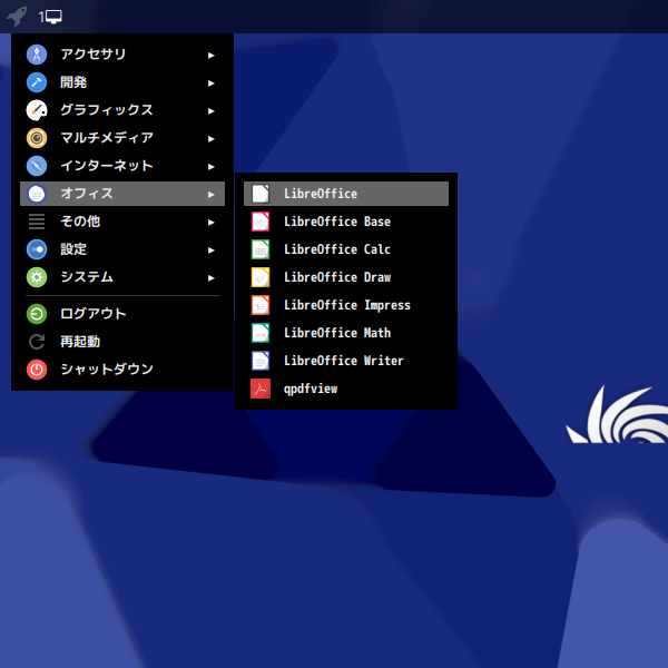 1. 概要 オフィススイートとして「LibreOffice」を使用します。 「i3wm」を「Openbox」上にインストールしていますが、「Openbox」には、「LibreOffice」は、デフォルトでは、インストールされていません。 2. インストール 「Synaptic」で、「libreoffice-l10n-ja」「libreoffice」を検索して、それぞれインストールします。 本体と言語パッケージと両方インストールしなければ、なりません。 3. 起動 「スタート」→「オフィス」→「LibreOffice」