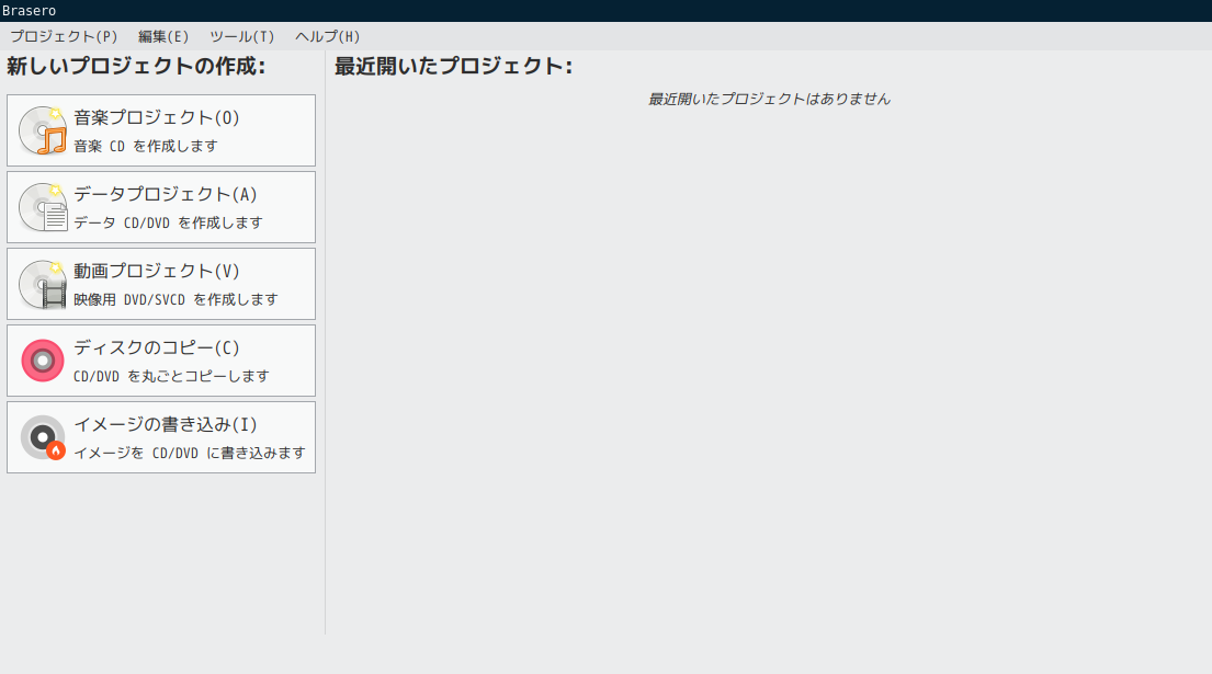 1. 概要 光ディスク(CD・DVD)ライティングソフトとして、「Brasero」を使用します。 2. インストール 「Synaptic」で、「brasero」を検索して、インストールします。 3. 起動 「スタート」→「マルチメディア」→「Brasero」