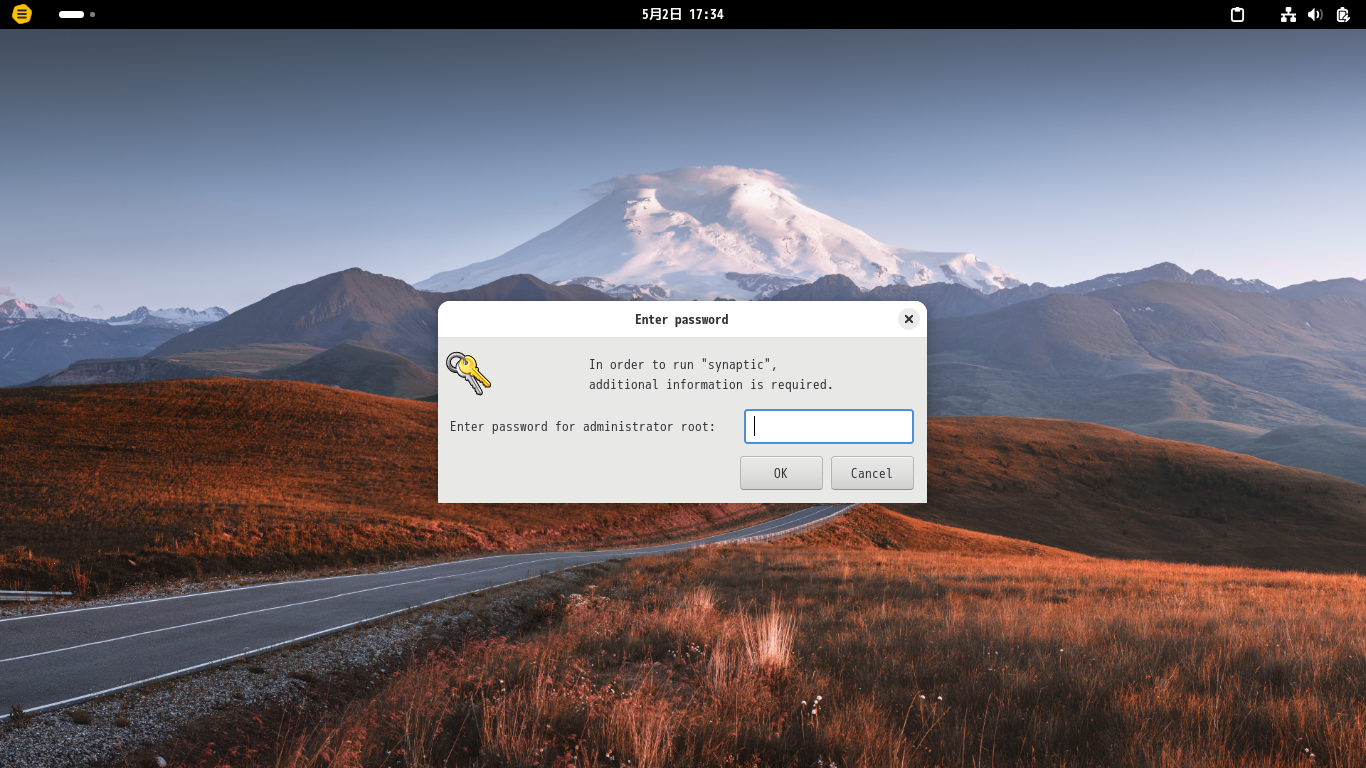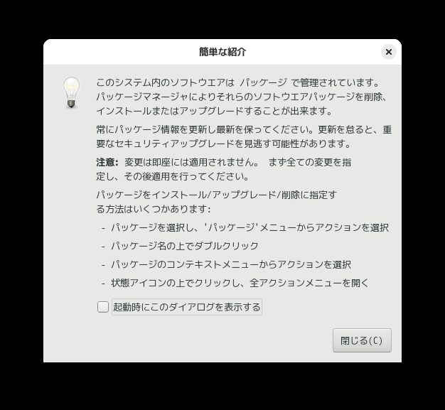 「root」ユーザのパスワードを入力して 「認証」 初回起動時は、紹介文が表示されます。 (他のディストリビューションでは、やたら巨大なのに対して、このディストリビューションはおとなしめです) 起動直後の状態です。 2025年5月2日の時点で、下記のバージョンでした。 |