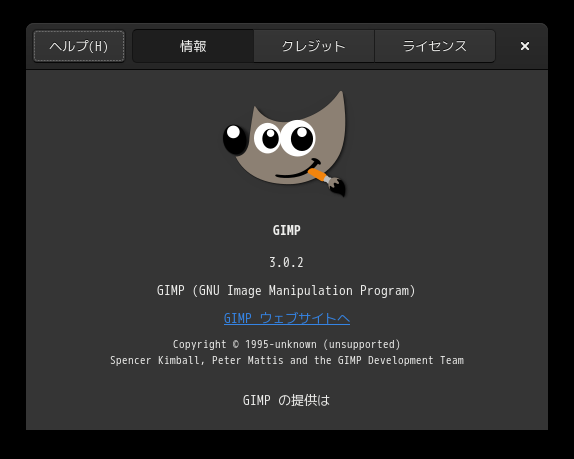 起動直後の状態です。 2025年5月2日の時点で、下記のバージョンでした。 「Linux」の各ディストリビューションでは、続々、「GIMP2」から「GIMP3」へ移行しているようです。 操作については、「画像編集ソフト GIMP2」に掲載しています。 上記は簡単なものですので、詳細なものがほしい方は、各所に初歩の手引きから応用編までありますので、そちらを参考にしてください。 |
