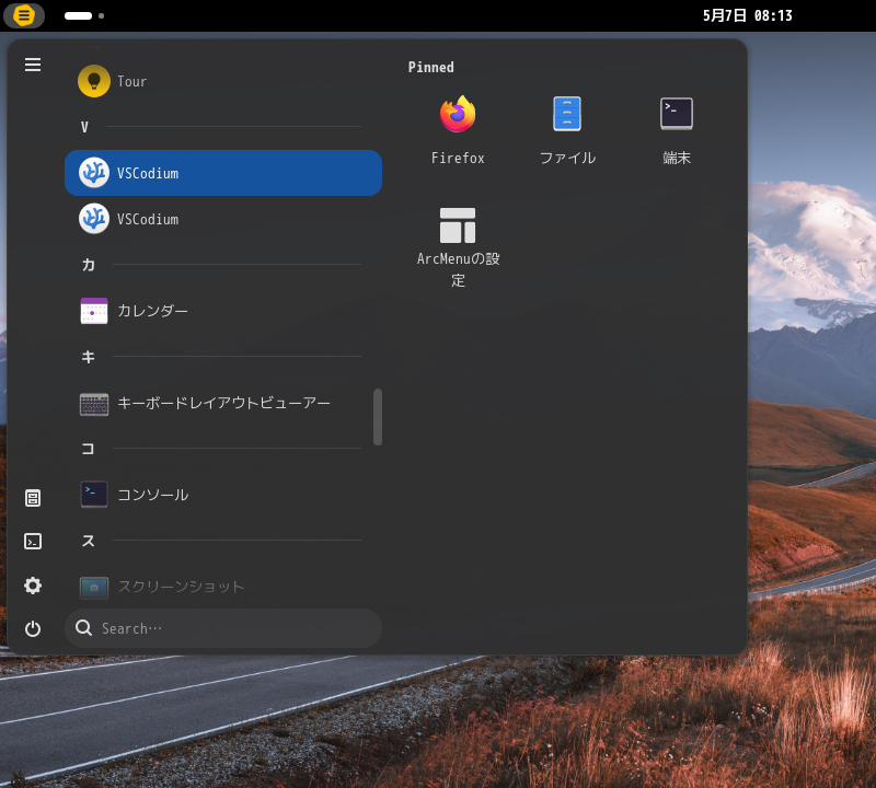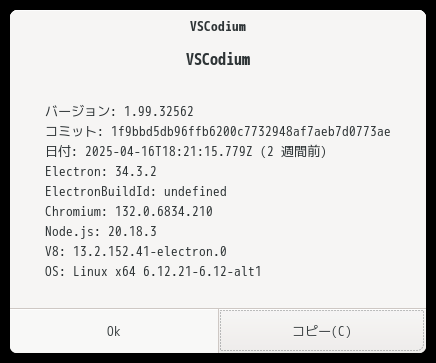1. 概要 開発環境として、「Visual Studio Code」を使用します。 2. インストール 「ソフトウェア(gnome-software)」で、「VScodium」を検索して、インストールします。 日本語化や操作に関しては、「Visual Studio Code」をご参照ください。 3. 起動 「スタート」→「V」→「VSCodium」