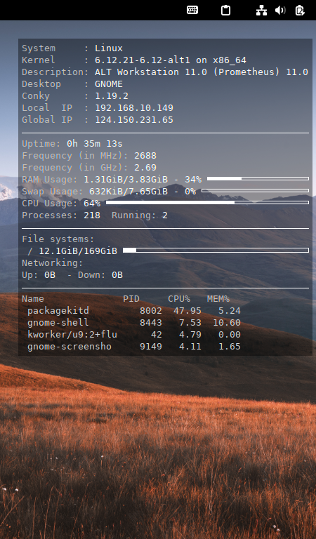 ログイン後に、デスクトップ右に、「Conky」の表示が現れます。