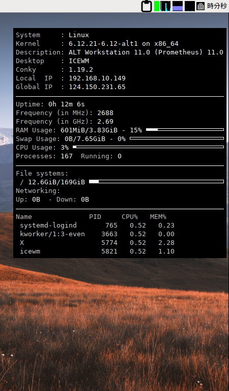 ログイン後に、デスクトップ右に、「Conky」の表示が現れます。
