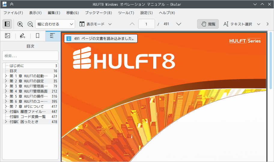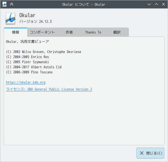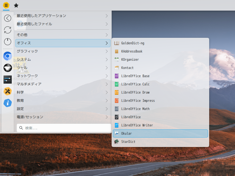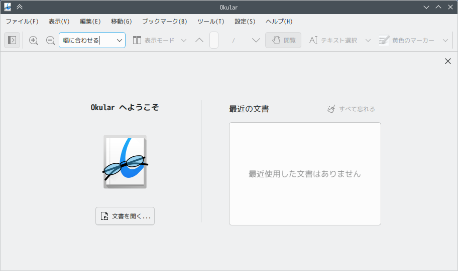 1. 概要 ドキュメントビューアとして、「Okular」を使用します。 「Okular」は、デフォルトでインストールされています。 2. 起動 「スタート」→「オフィス」→「Okular」