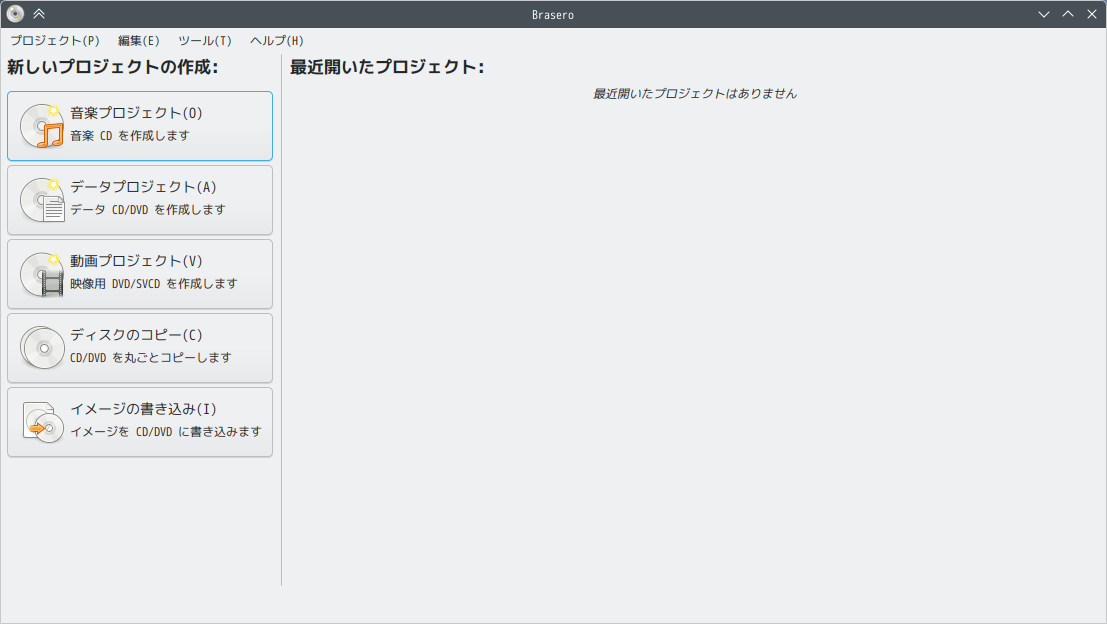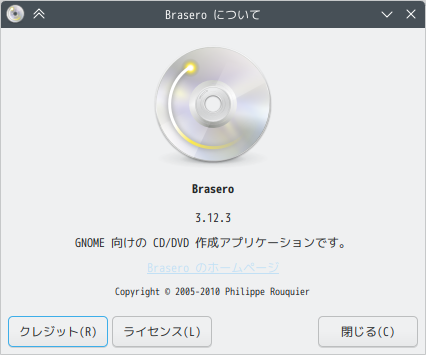 1. 概要 光ディスクのライティングソフトとして、「Brasero」を使用します。 2. インストール 「root」ユーザ権限で。 apt-get install -y brasero 3. 起動 「スタート」→「サウンドとビデオ」→「Brasero」