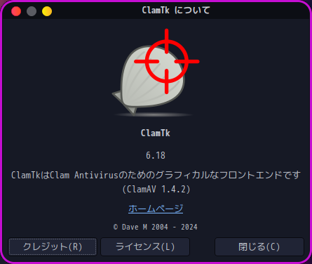 起動直後の状態です。 2025年3月10日の時点で、下記のバージョンでした。 操作方法については、「デスクトップ環境構築 - 共通事項 - ClamTk」をご参照ください。 |