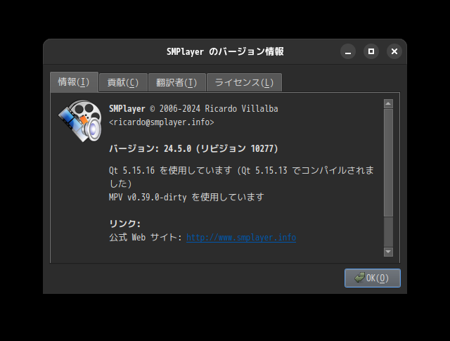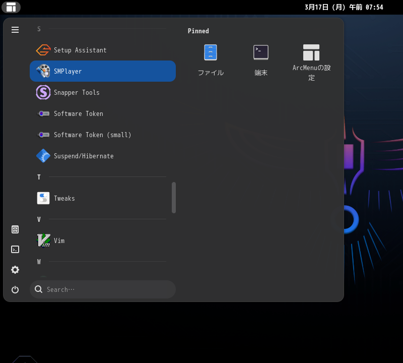 1. 概要 マルチメディアプレイヤーとして「SMPlayer」を使用します。 2. インストール 「Pamac」で、「smplayer」を検索して、インストールします。 3. 起動 「スタート」→「S」→「SMPlayer」
